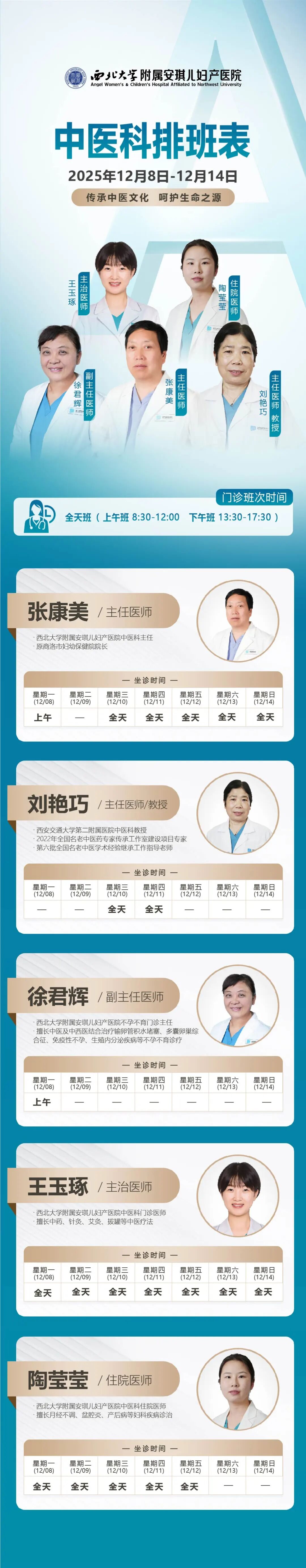 西安安琪儿妇产医院(12月8日至12月14日)专家坐诊时间表