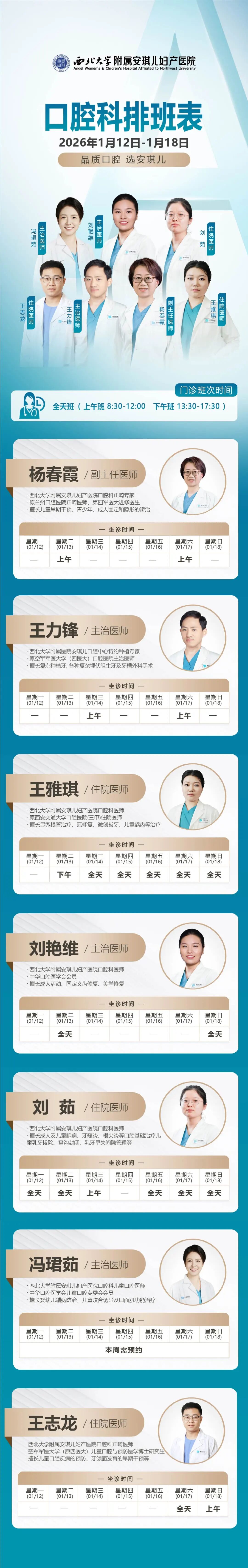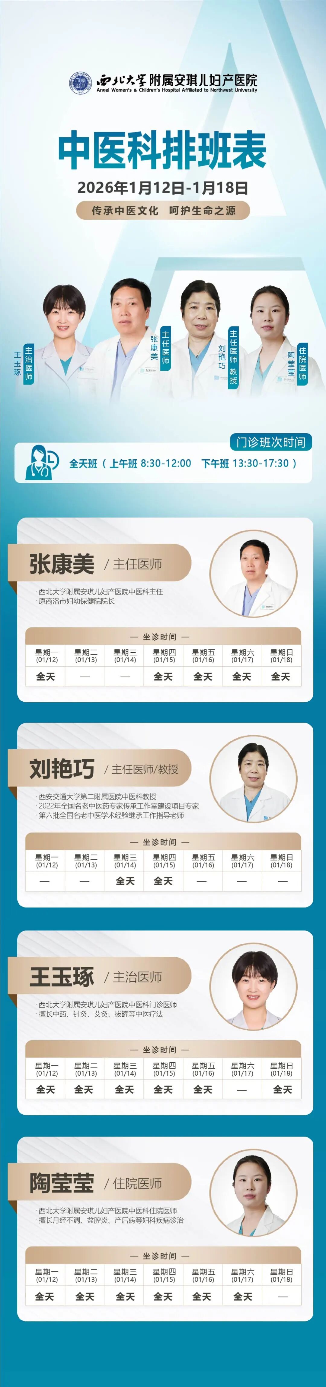 西安安琪儿妇产医院(1月12日至1月18日)专家坐诊时间表